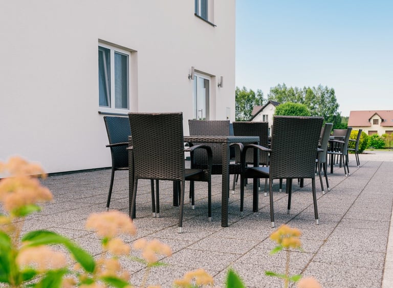 Altany grillowe, ławki, stoliki – wszystko gotowe na wieczorne rozmowy i rodzinne kolacje pod chmurką.